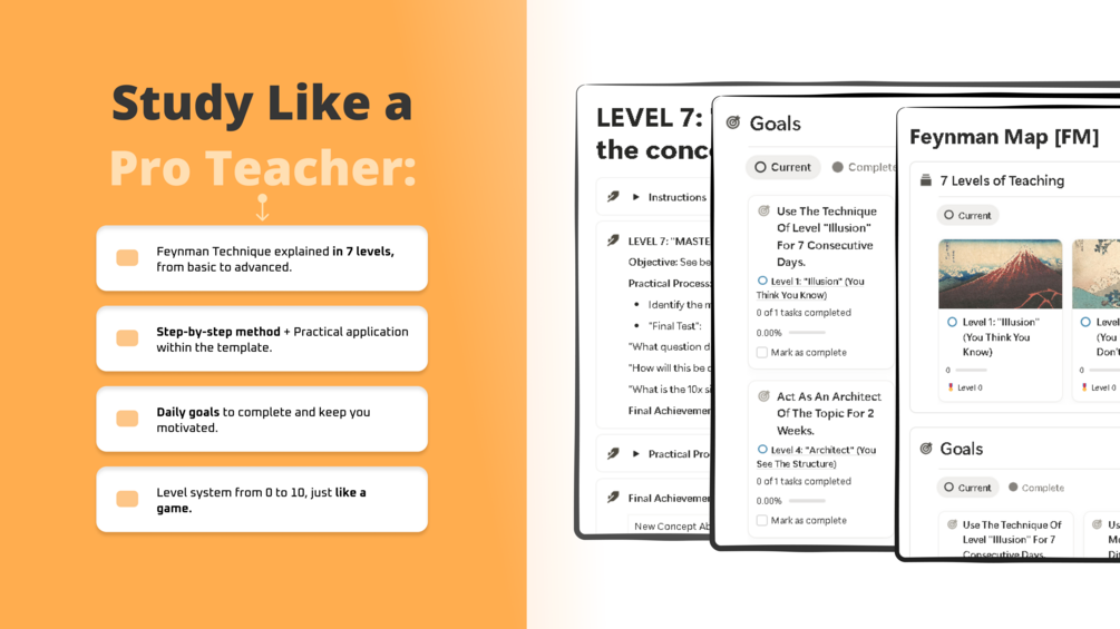 A gamified system in Notion based on Nobel laureate Richard Feynman's technique. Transform any complex concept into deep knowledge through 7 progressive levels.