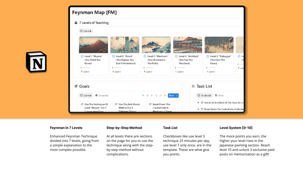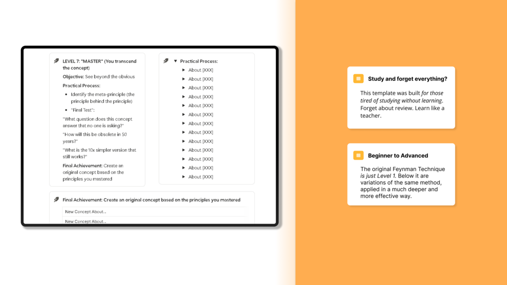 A gamified system in Notion based on Nobel laureate Richard Feynman's technique. Transform any complex concept into deep knowledge through 7 progressive levels.
