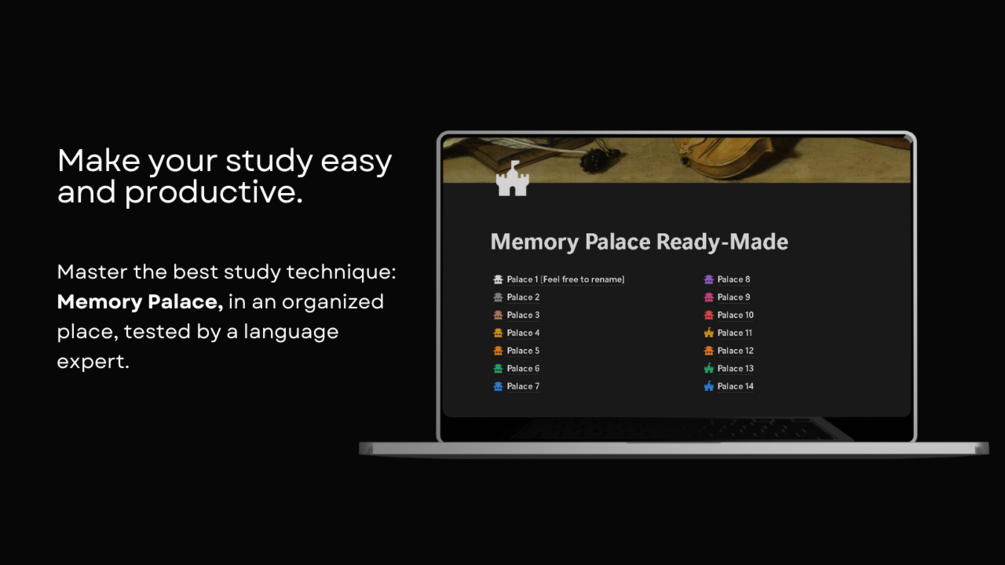 • 14 ready-to-use Memory Palaces with 377 stages (37$ Value).